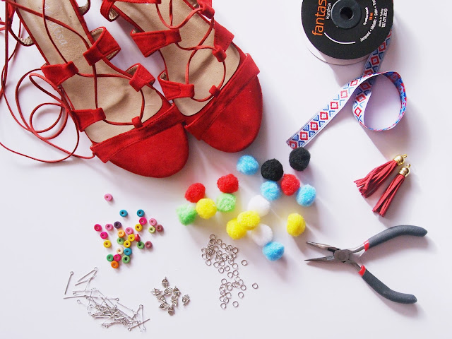 Материалите които ми трябват са: помпони (ама разбира се), пискюли, ширит, мъниста, метални халки, свързващи елементи, клещи и лепило. Може да добавите и друг вид декорации по ваш избор. Докато си набавя всичко необходимо, станах редовен клиент на Магазин Баба Марта в Бургас, защото всеки път забравях нещо. Трябва да започна да пазарувам по списък.